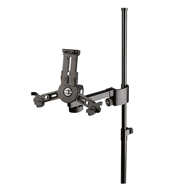 El soporte de soporte para Tablet PC K&M 19796 tiene un ángulo de giro de 90 grados, ideal para lugares con poca luz. Con una tuerca de mariposa, permite ajustar el ángulo a las necesidades de cada persona. El cierre a presión permite una fácil configuración. Este modelo es ideal para músicos que necesitan su tableta para partituras o aplicaciones relacionadas con la interpretación. Nota: la tableta no está incluida en este producto.